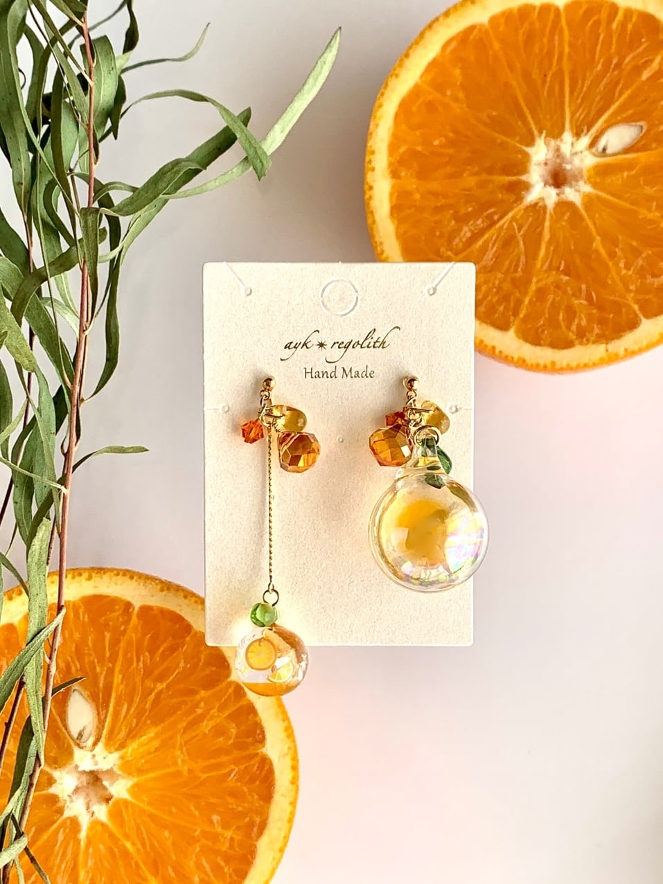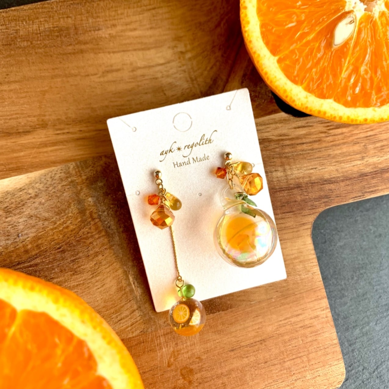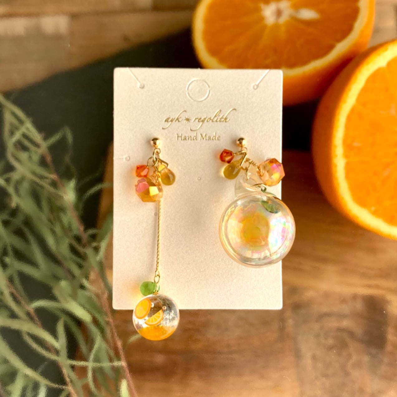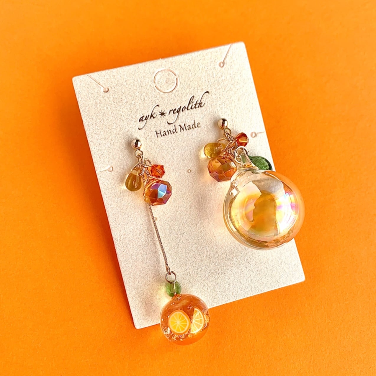 オレンジ好きの方、推しカラーがオレンジの方、アシンメトリーなデザインがお好きな方にオススメな耳飾りです。