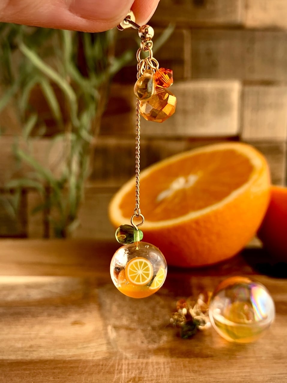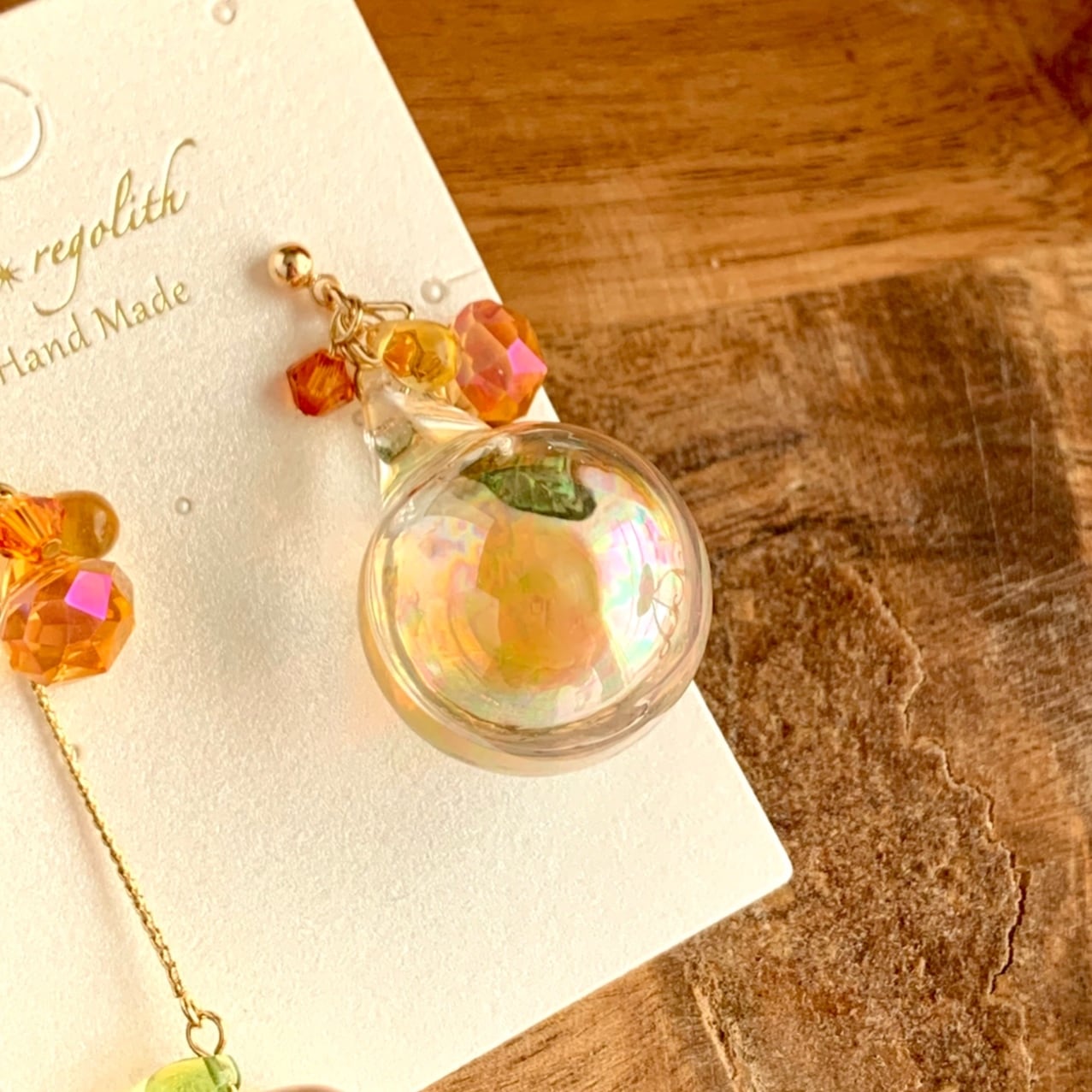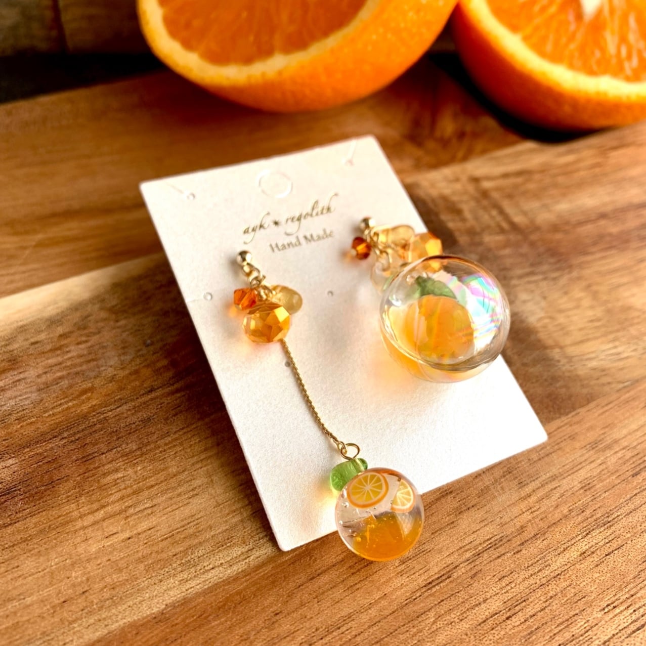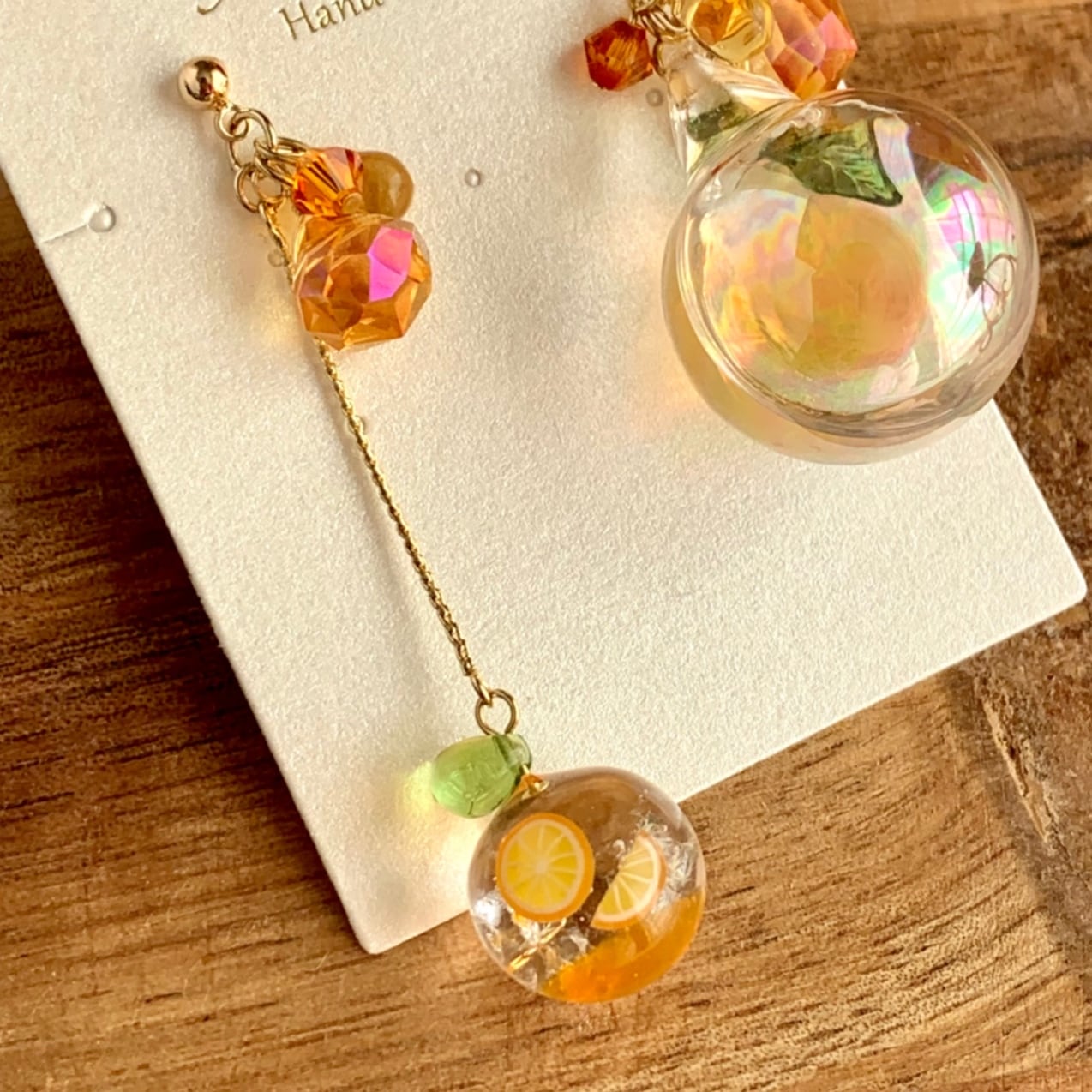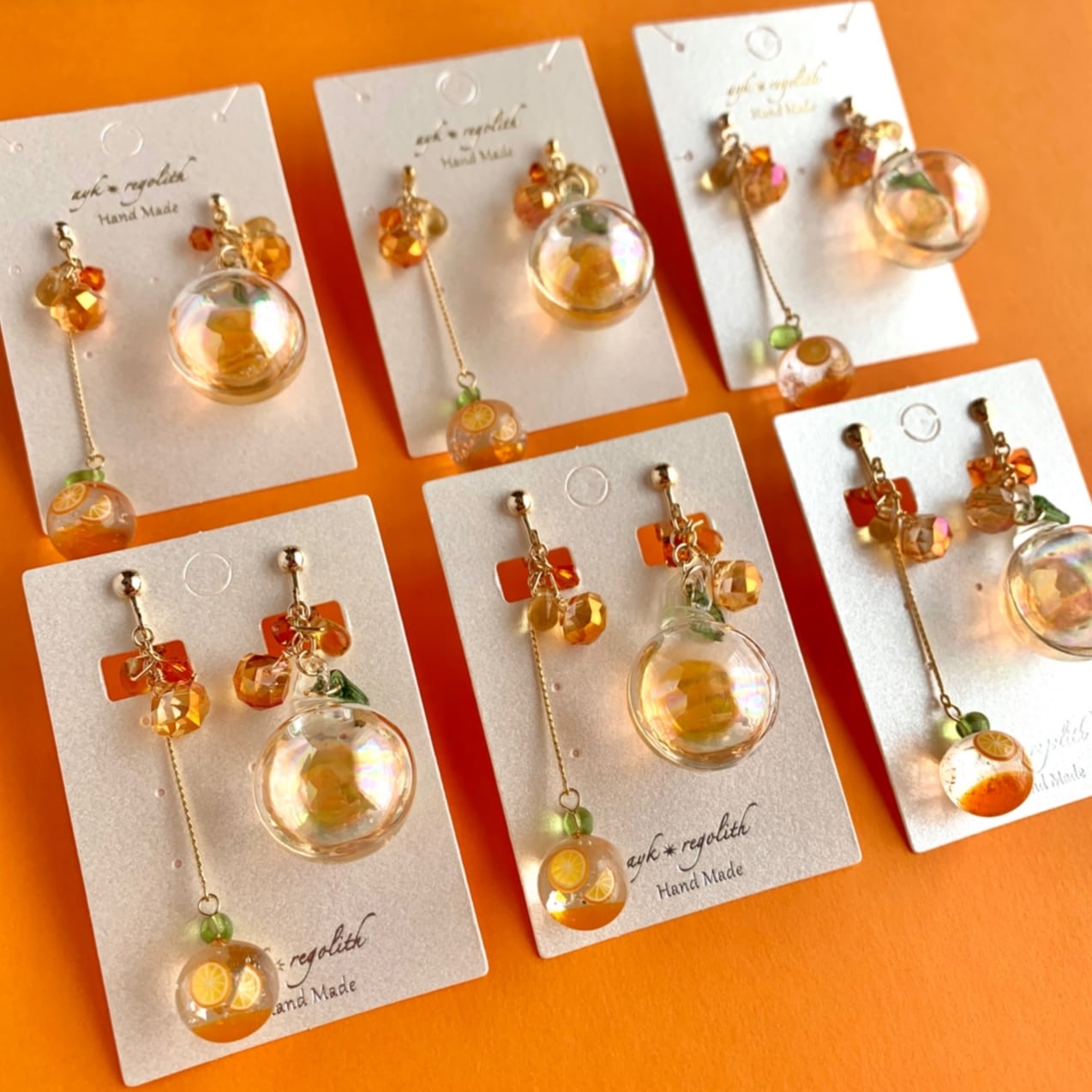 オレンジ好きの方、推しカラーがオレンジの方、アシンメトリーなデザインがお好きな方にオススメな耳飾りです。