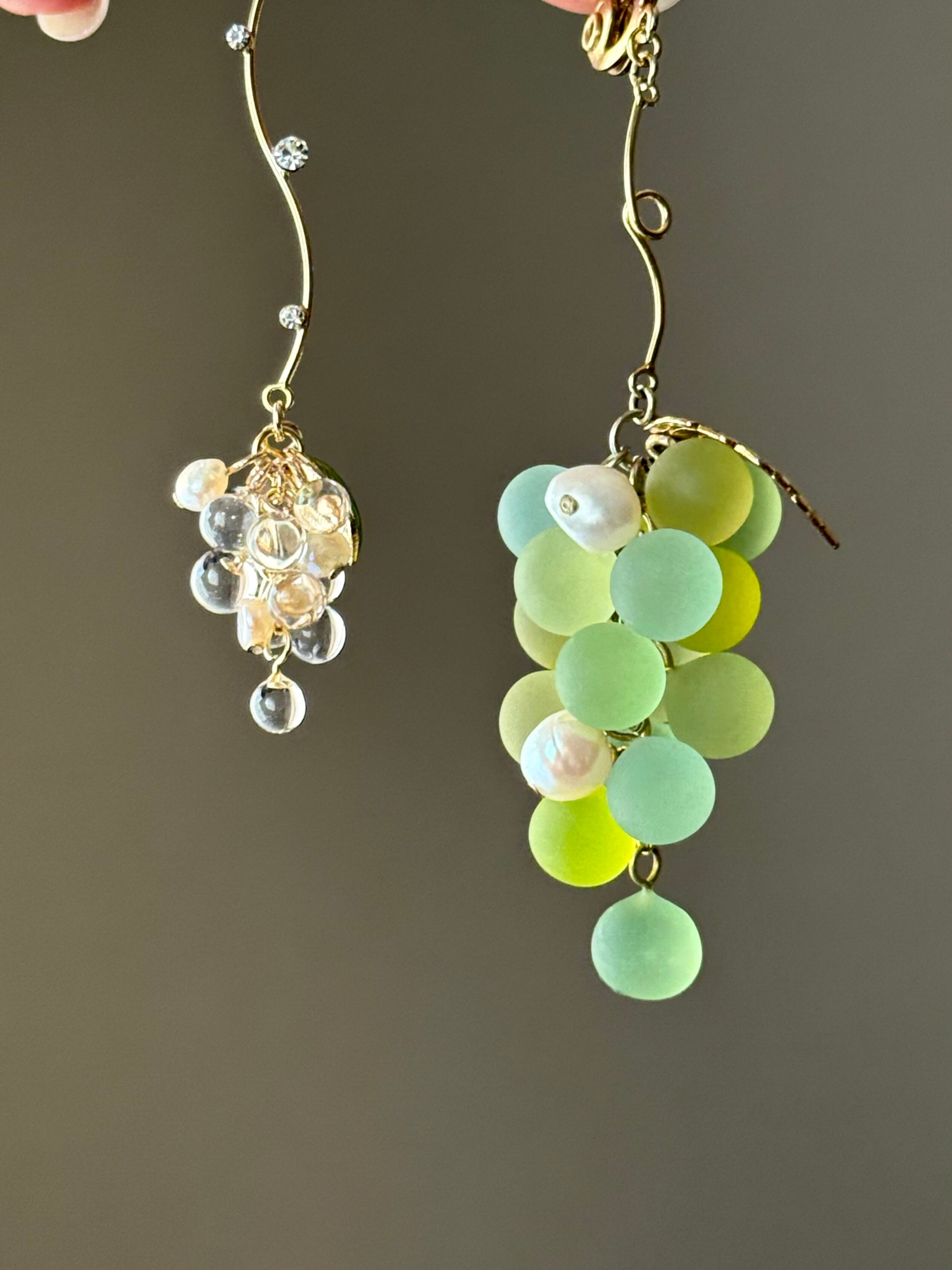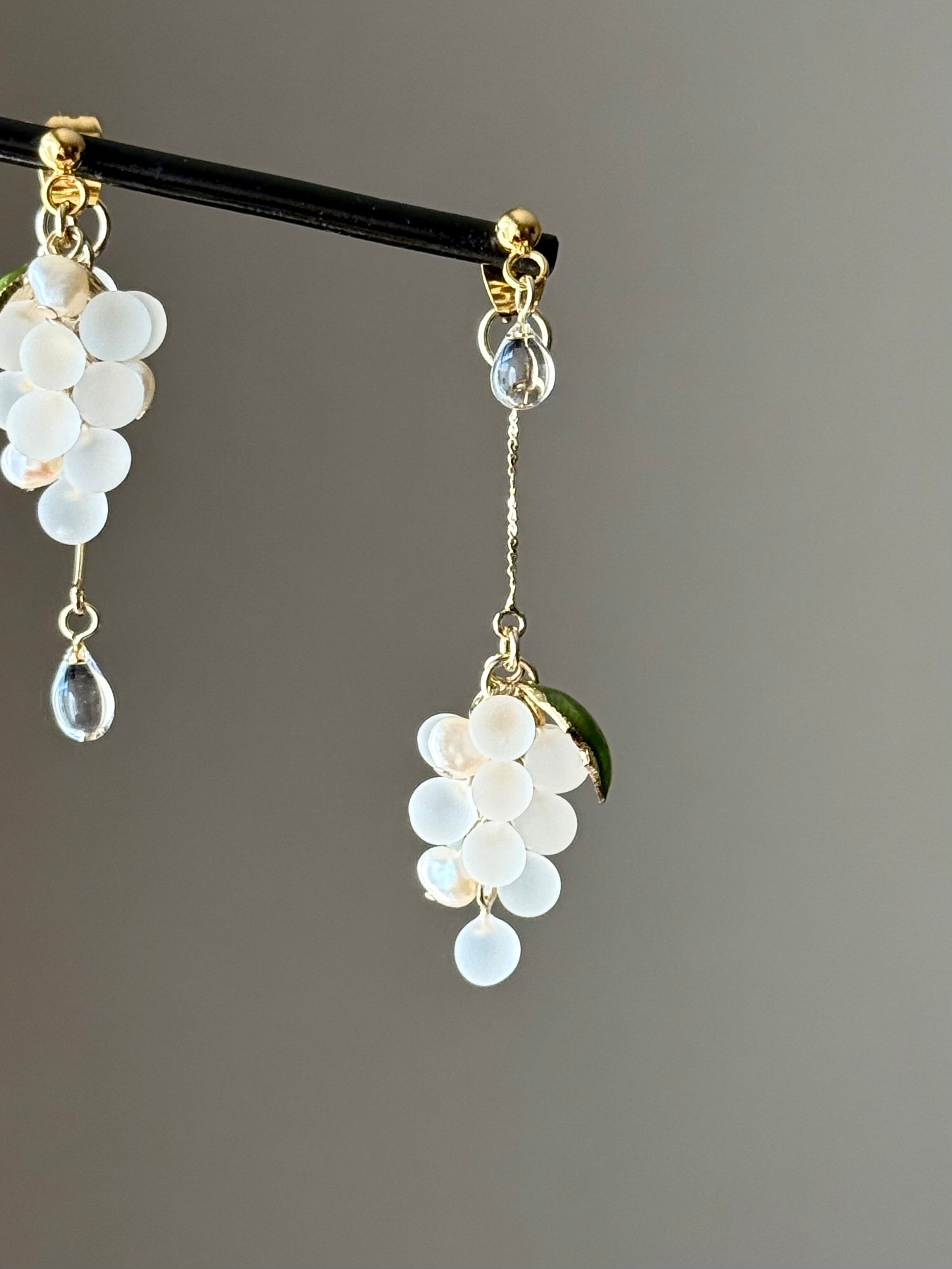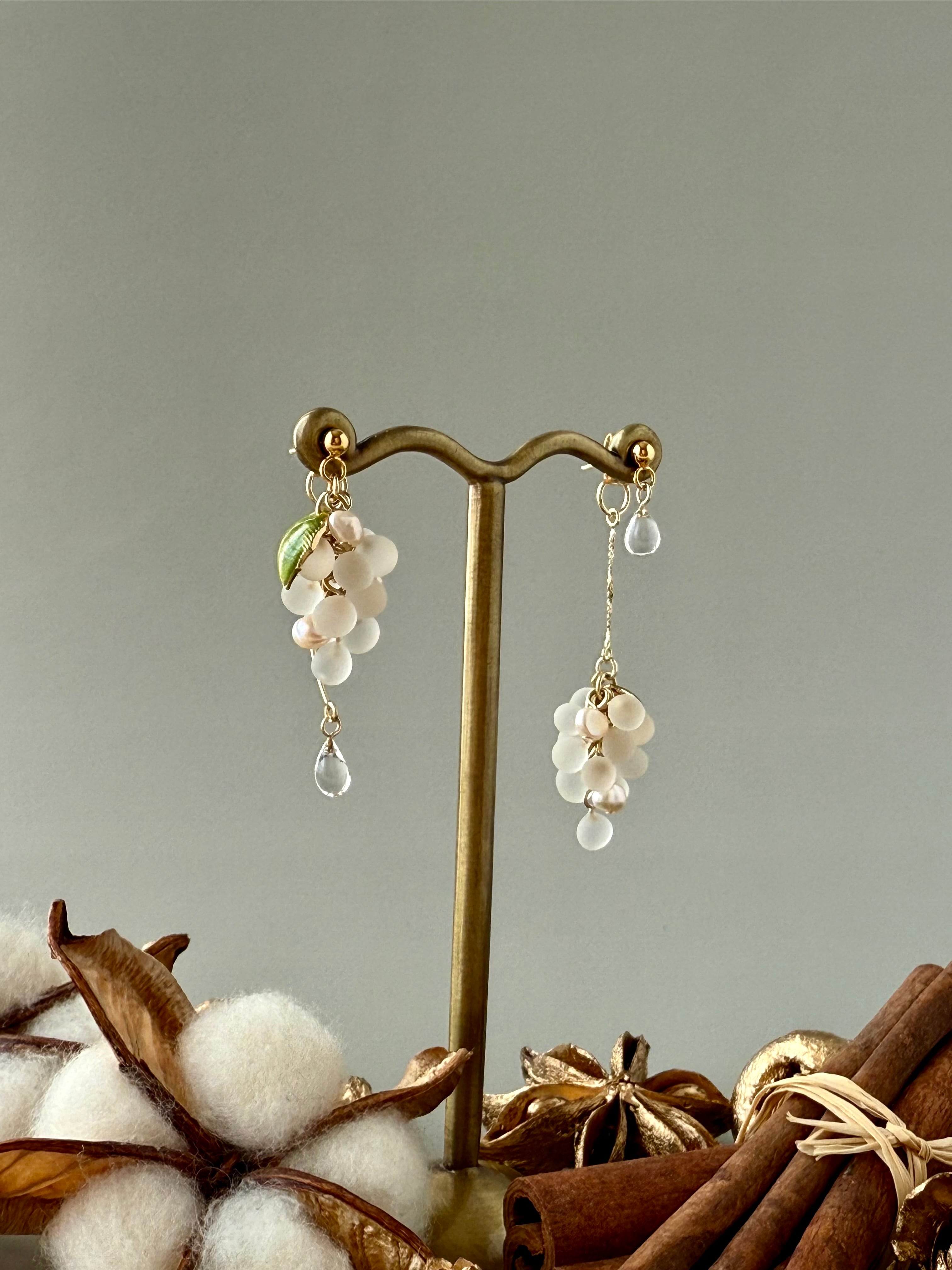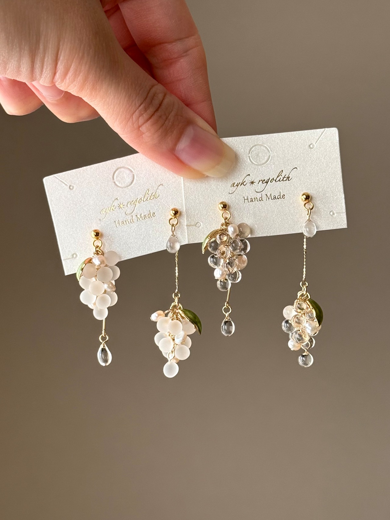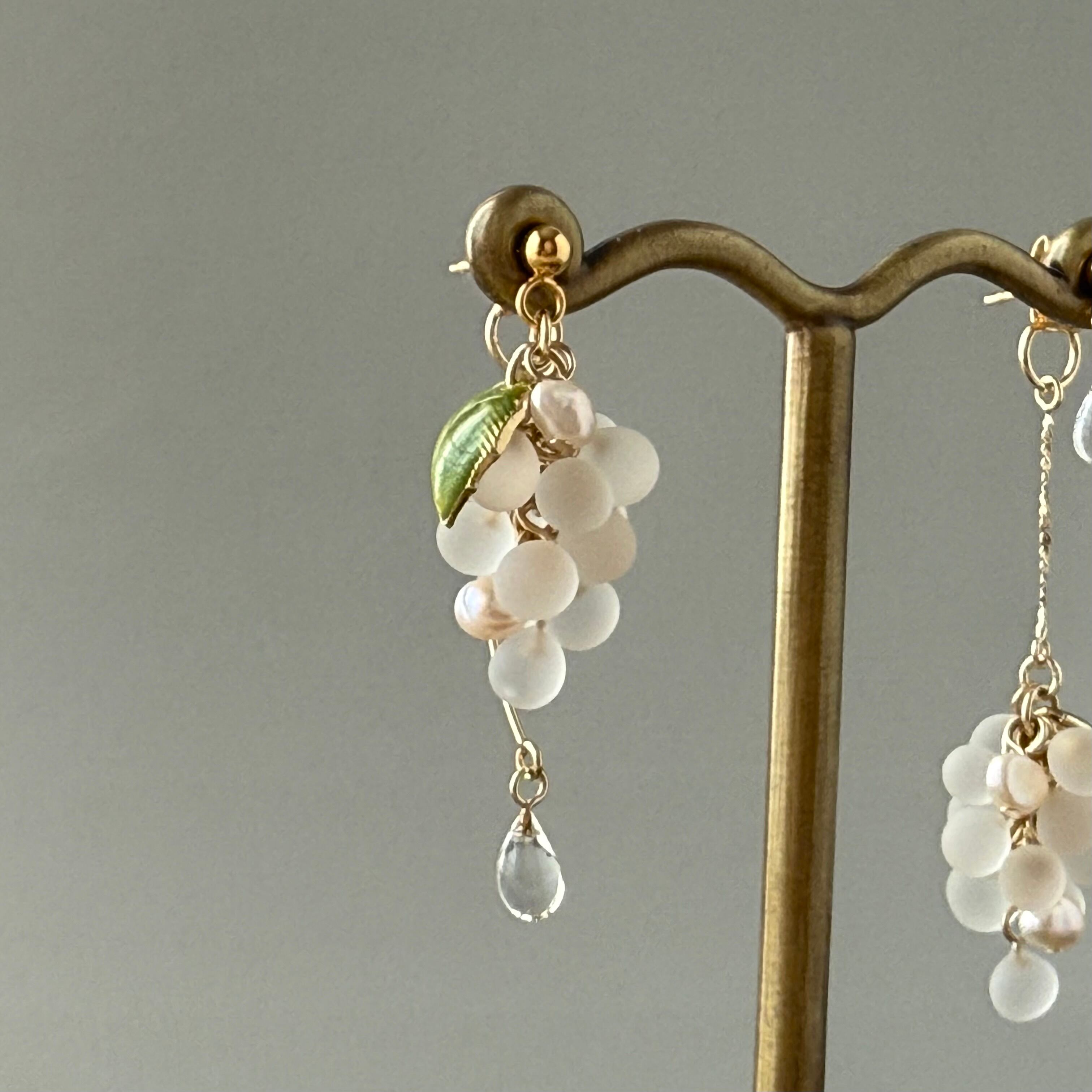 遊び心のある葡萄モチーフのデザインに、大人な印象のクリア×淡水パールを組み合わせて絶妙なバランスで仕上げました。