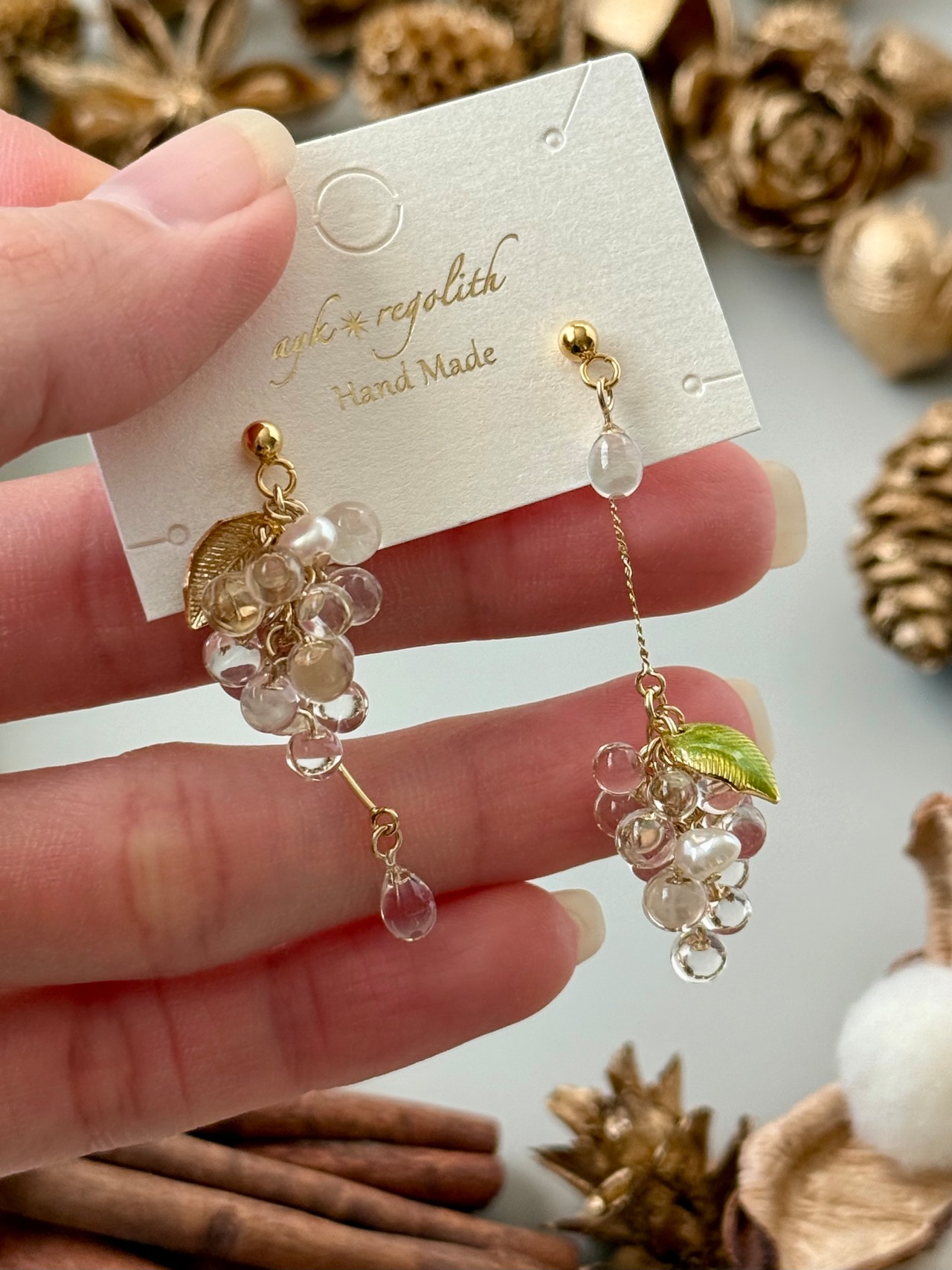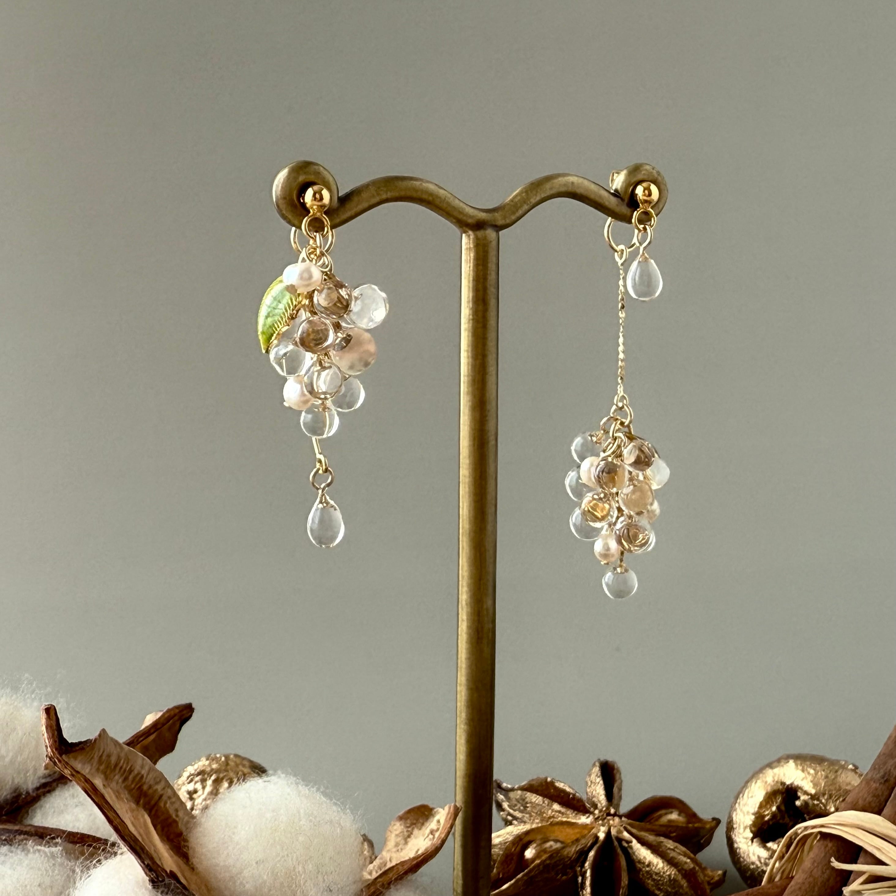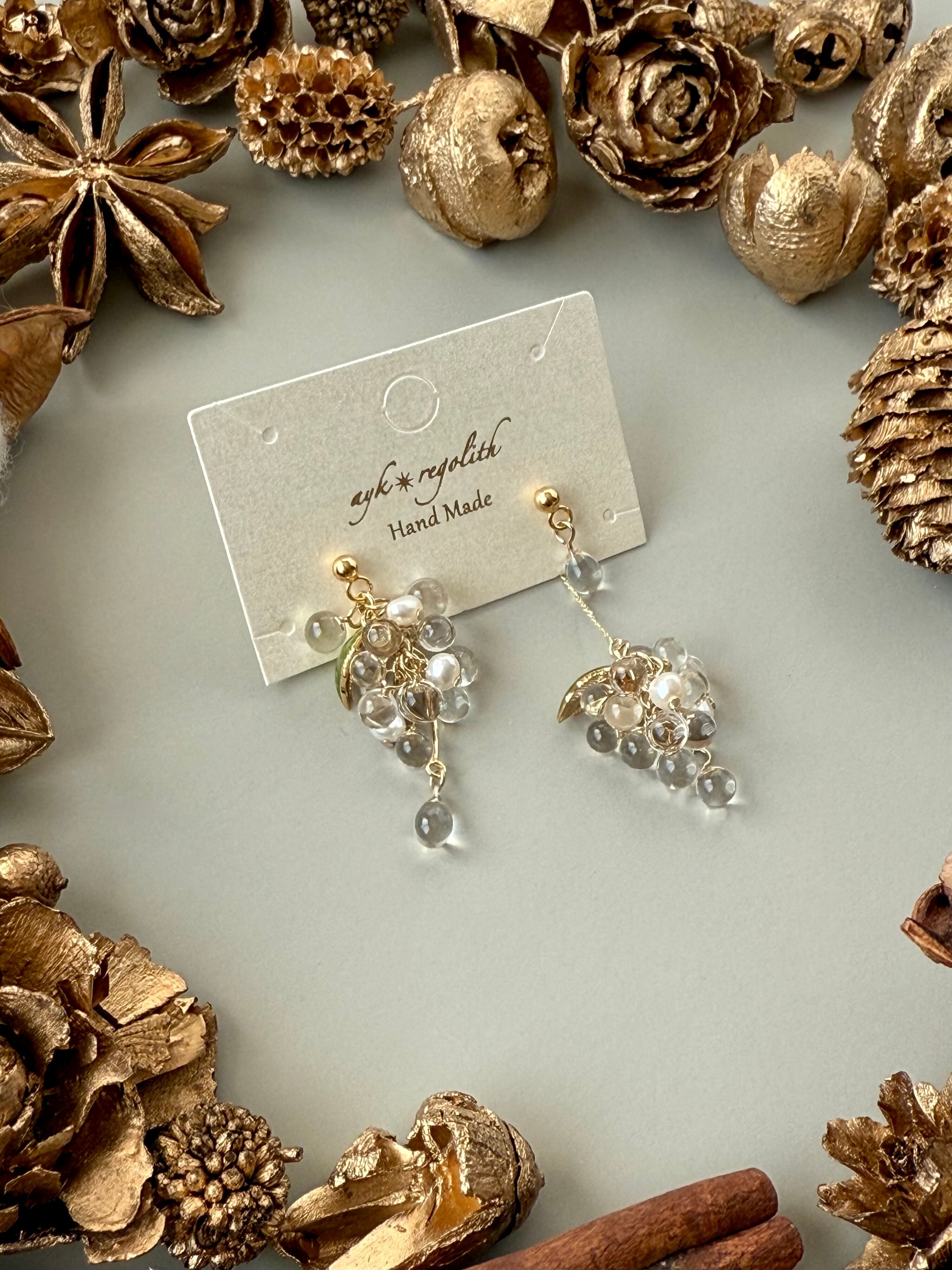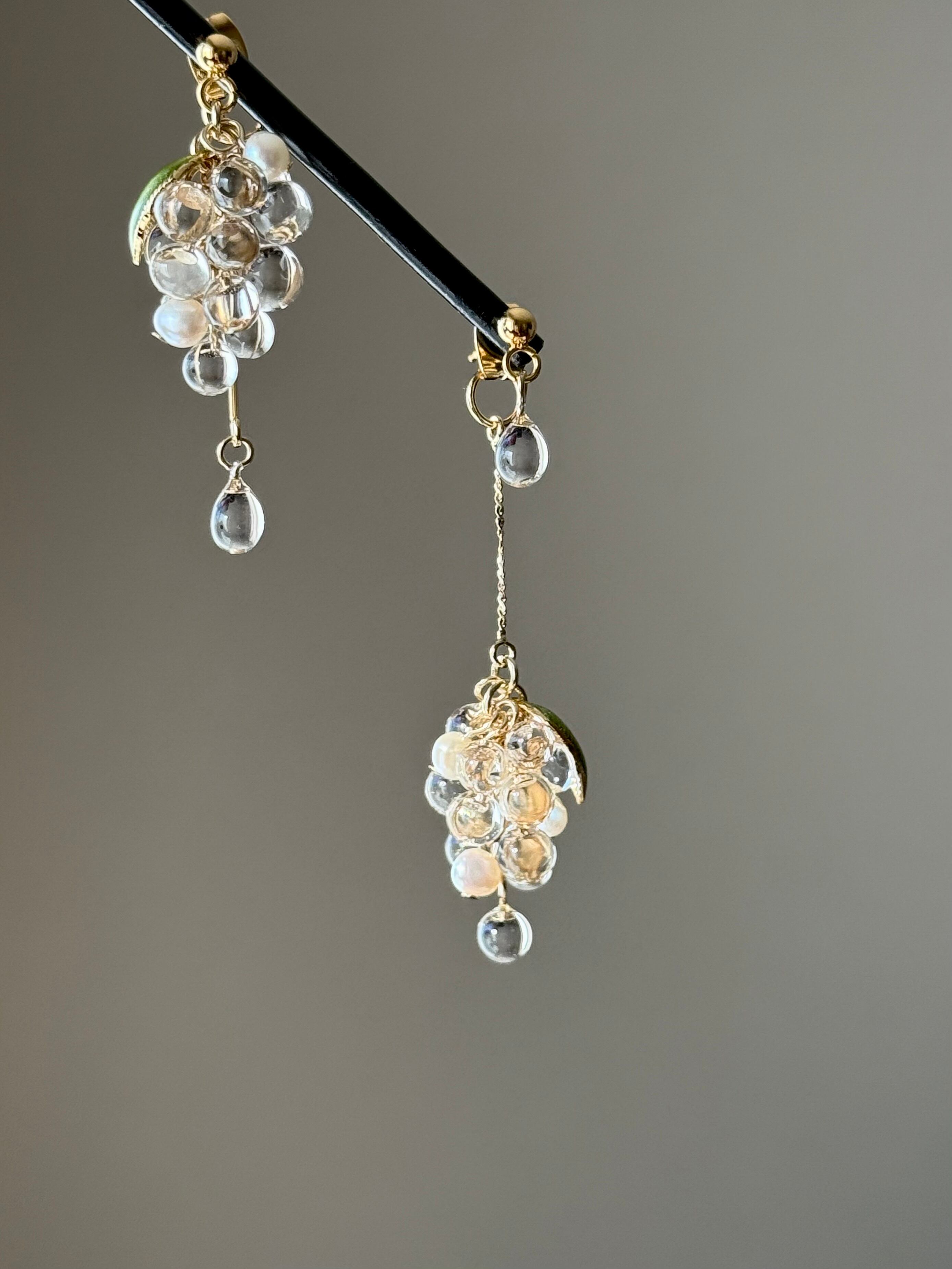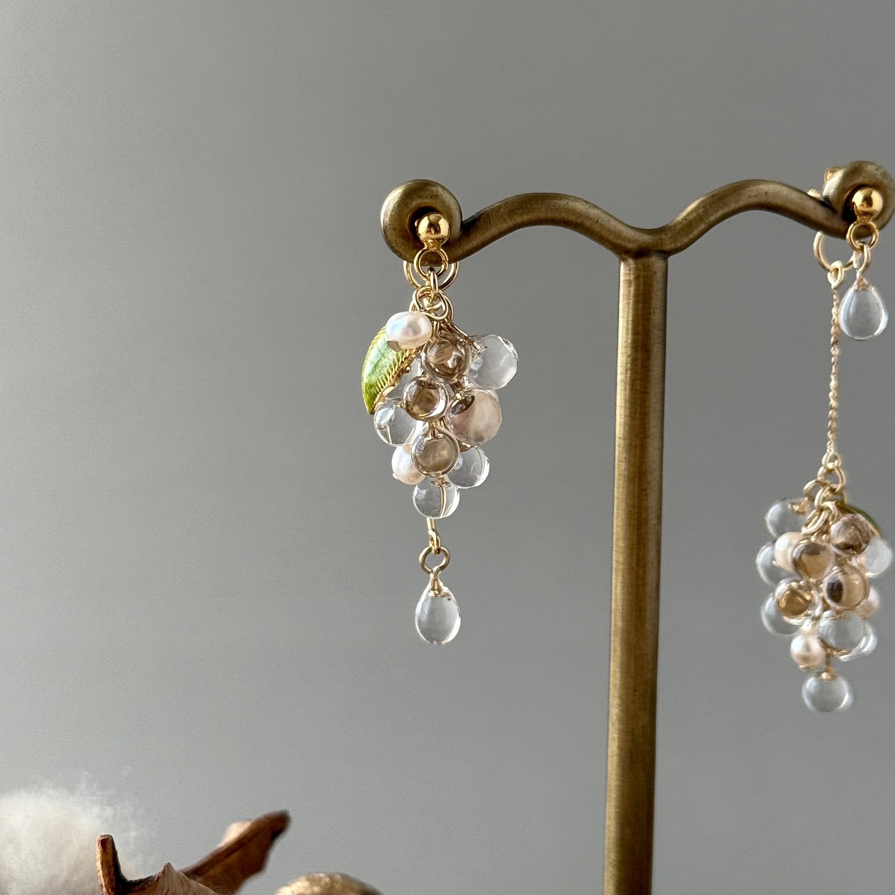 遊び心のある葡萄モチーフのデザインに、大人な印象のクリア×淡水パールを組み合わせて絶妙なバランスで仕上げました。